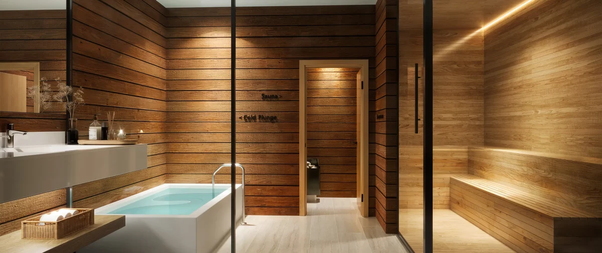 Spa con sauna, vapor y cold plunge.